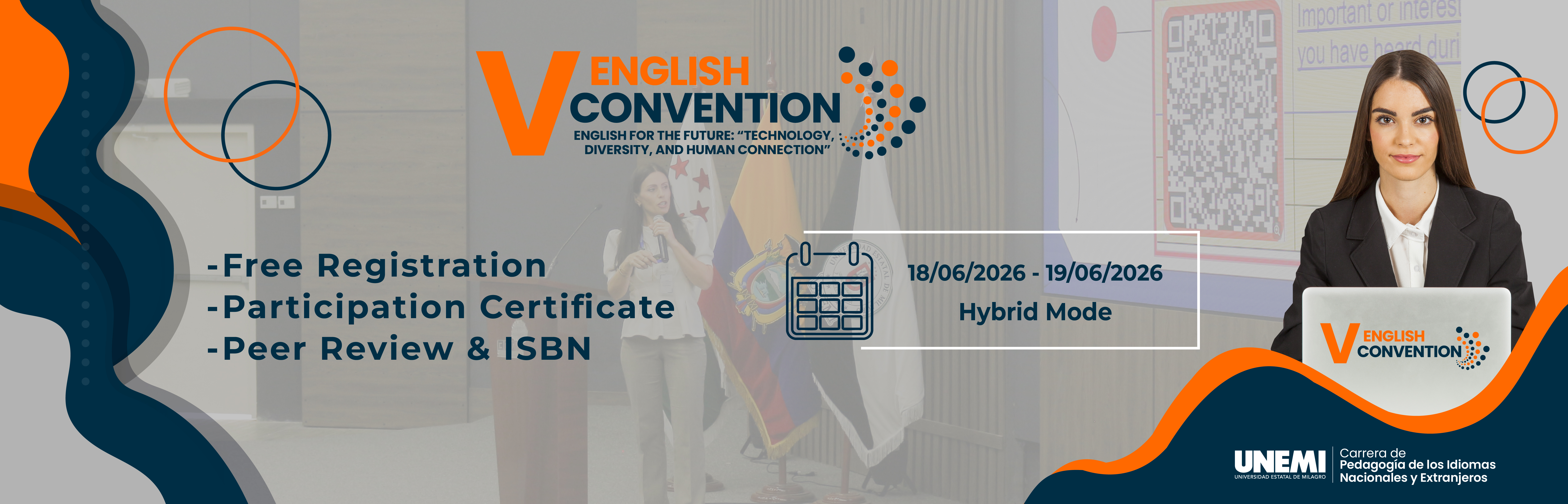The V English Convention: “English for the Future: Technology, Diversity, and Human Connection” is an international academic conference organized by the State University of Milagro (UNEMI), through the Faculty of Research and the Degree Program in Pedagogy of National and Foreign Languages.